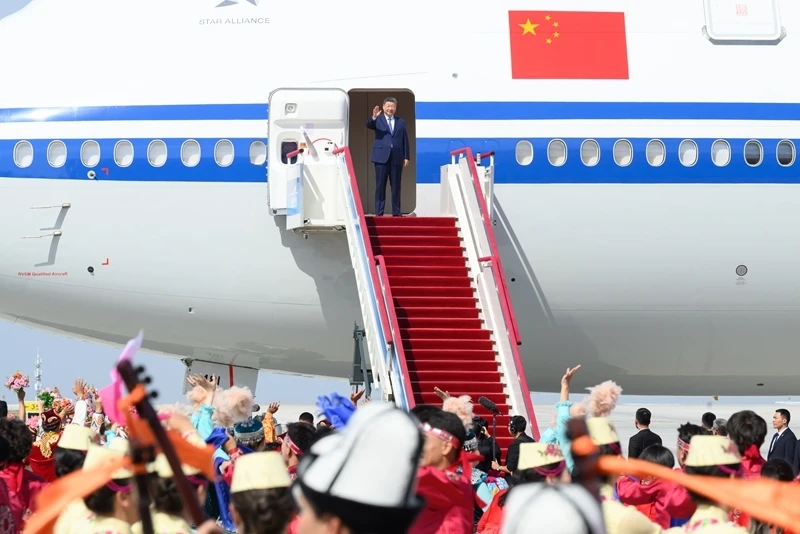 新疆维吾尔自治区党委书记陈小江、自治区人民政府主席艾尔肯·吐尼亚孜、自治区人大常委会主任祖木热提·吾布力、自治区政协主席努尔兰·阿不都满金、新疆生产建设兵团政委何忠友等在舷梯下迎候。习近平走下舷梯时,少先队员献上鲜花。各族群众代表身着民族服饰,载歌载舞,欢迎总书记的到来,表达对总书记的衷心祝福。