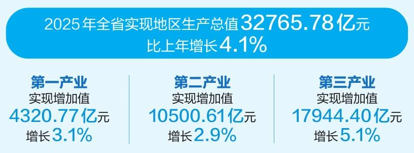 1月21日,2025年云南经济“年报”出炉。根据地区生产总值统一核算结果,2025年全省实现地区生产总值32765.78亿元,按不变价格计算,比上年增长4.1%。分产业看,第一产业实现增加值4320.77亿元,增长3.1%;第二产业实现增加值10500.61亿元,增长2.9%;第三产业实现增加值17944.40亿元,增长5.1%。