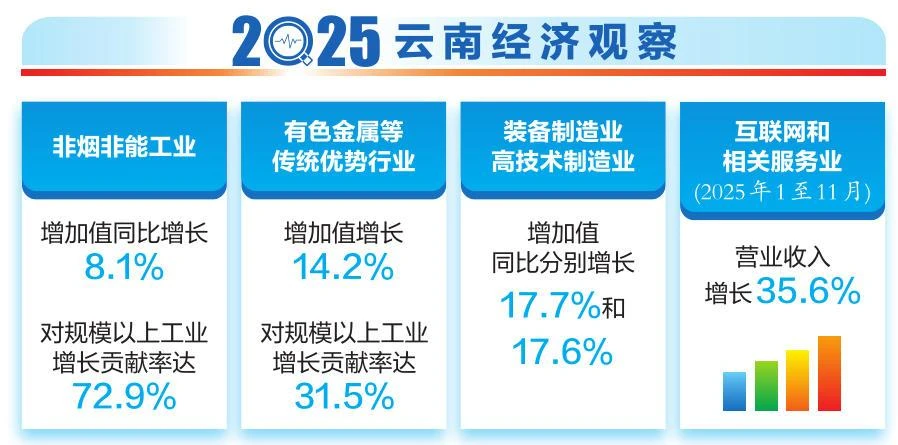 新动能的培育,离不开科技创新与产业创新的协同发力。2025年,云南实体经济和数字经济深度融合趋势更加显著。2025年1至11月,全省互联网和相关服务业营业收入飙升35.6%。这一领域的持续高速增长,说明“数字云南”建设正从基础建设迈向深度融合,成为激活经济系统效率的关键。